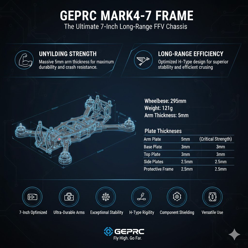 The GEPRC Mark4-7 is a premier 7-inch H-type drone frame engineered for pilots who demand a balance of agility and “tank-like” durability. Built from high-grade carbon fiber, this frame is the perfect foundation for high-performance freestyle builds or long-range cruisers.