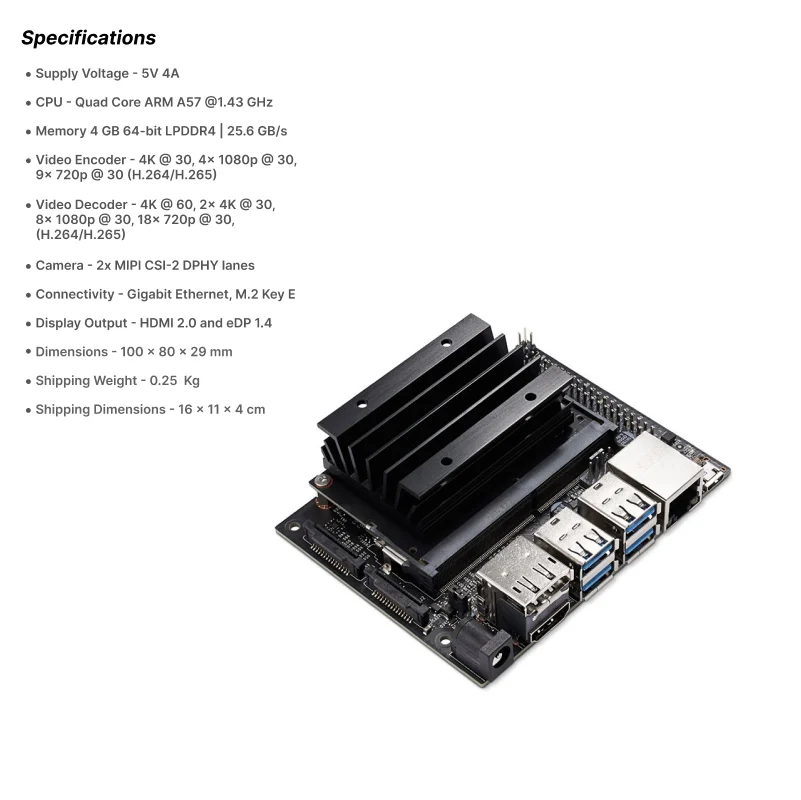 NVIDIA Jetson Nano Developer Kit delivers the performance to run modern AI workloads in a small form factor, power-efficient (consuming as little as 5 Watts), and low cost. Developers, learners, and makers can run AI frameworks and models for applications like image classification, object detection, segmentation, and speech processing.